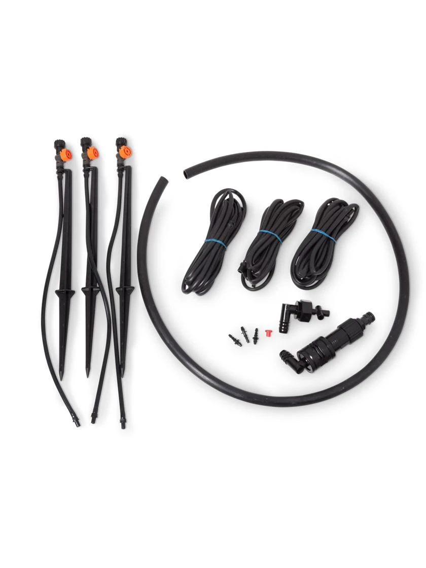 This may be our favorite raised bed irrigation system yet! Easy to set up and customizable, it includes fittings to go up and over your beds. The three adjustable bubblers (or microsprinklers) are on 12″ self-staking spikes with 10 feet of flexible 1/4″ tubing that’s incredibly easy to work with. Three 1/4″ connectors are included so you can completely customize this hose length. Each half-circle sprinkler is also adjustable so you can precisely pin-point your watering. Plus you get 4′ of leader tubing, a pressure regulator and quick connector so attaching to your spigot is a breeze.